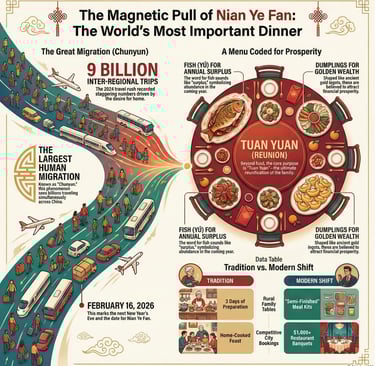Discover why billions travel for the Reunion Dinner (Nian Ye Fan). We explore the symbolism, the 9-billion trip Chunyun migration, and modern CNY traditions.