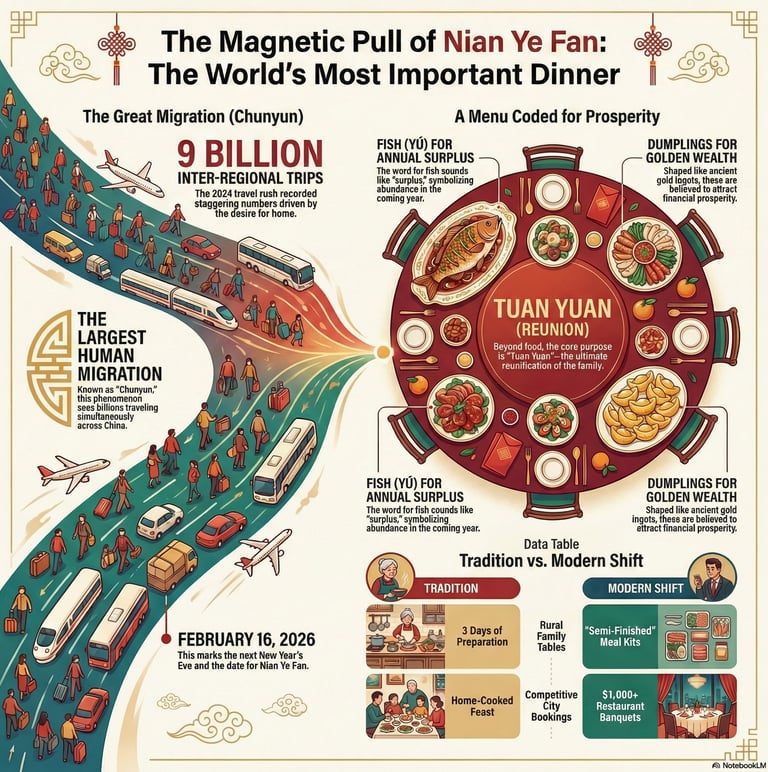 Why do billions of people endure crowded trains, jammed highways, and sky-high ticket prices to travel thousands of miles? They aren't going on vacation. They are racing home for one specific meal: the Family Reunion Dinner, or Nian Ye Fan (年夜饭).